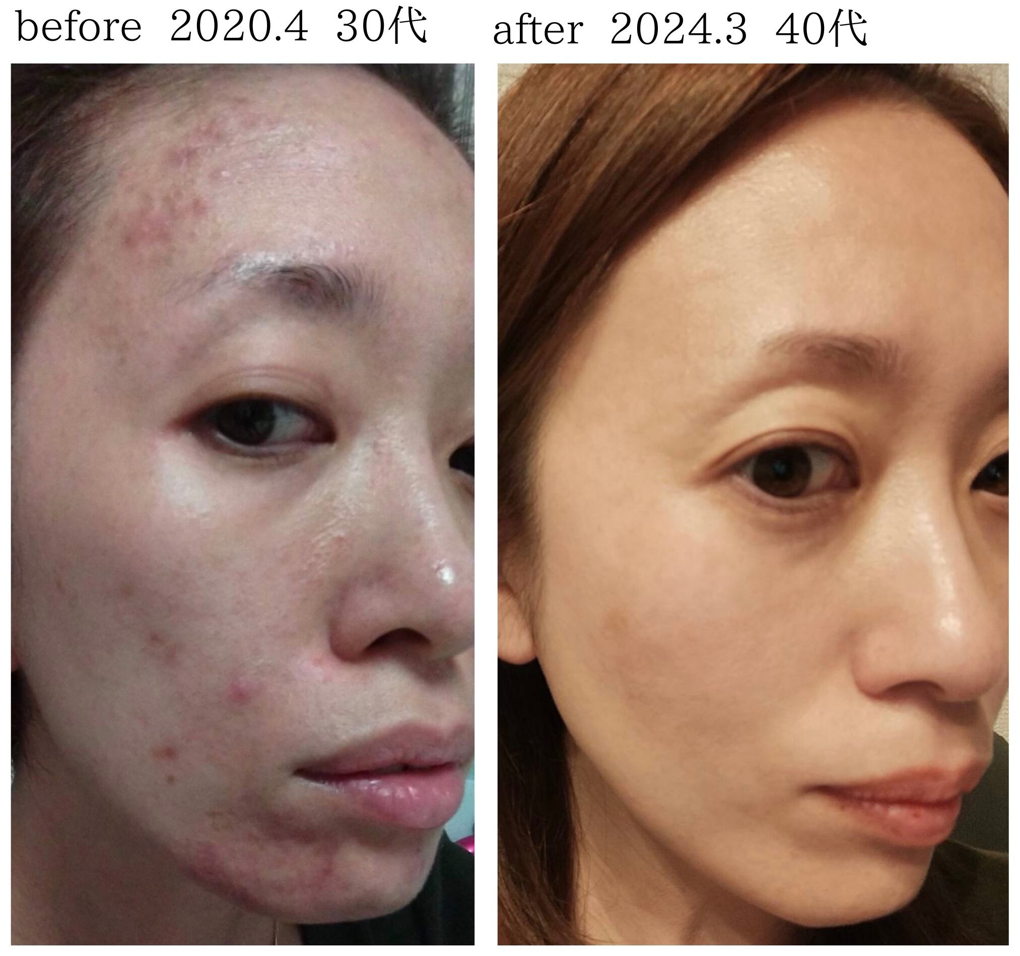 毛穴の黒ずみやざらつき、ぼこぼこ、シミも薄くなり、現在ニキビはほぼできません。10代〜30代までの悩みは少しずつ解消され現在の40代の肌が1番良い状態です。